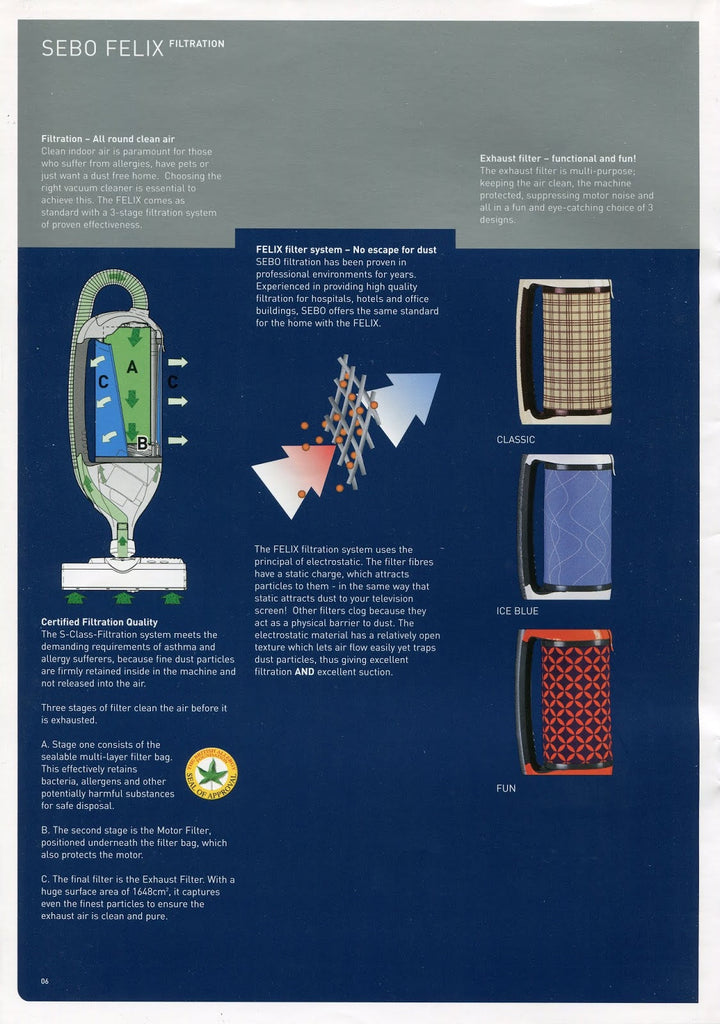 Sebo Felix Premium is the most maneuverable and portable upright vacuum cleaner. Its design is 100% unique featuring a large side carry handle and detachable power head. You can even carry it around as a handheld canister to easily vacuum stairs, furniture and window treatments. Sebo Felix Premium vacuum cleaners are very powerful with plenty of suction for cleaning carpets and bare floors. They come standard with an excellent S-class (meets HEPA standards) filtration system, manual height adjusting power head, parquet floor brush and 2 accessory tools. The Sebo Felix Premium will make sure your house is clean and dust-free in no time. Includes Sebo’s10 -year warranty on parts, 7 year labor warranty .